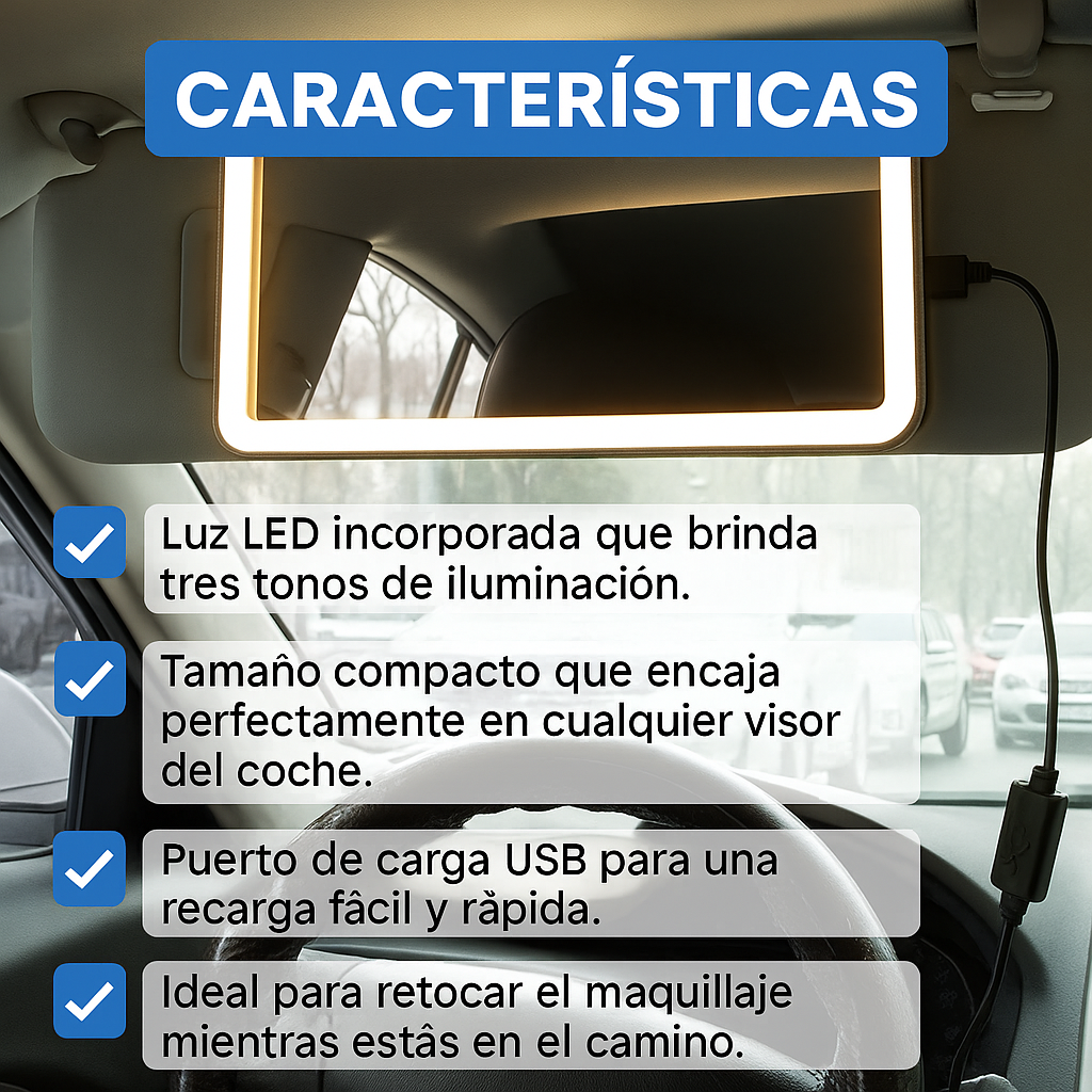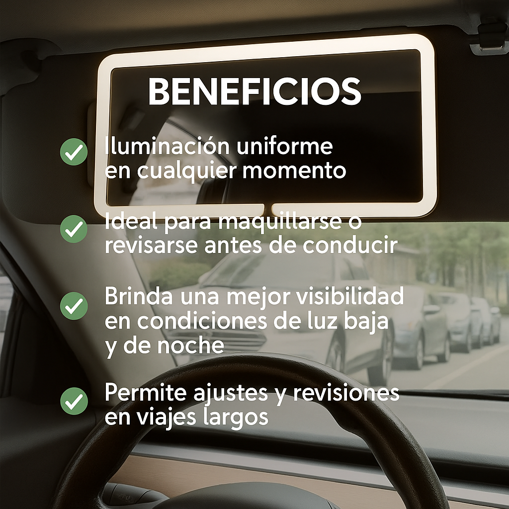 Perfecto para retocar tu maquillaje con luz clara y uniforme mientras estás en el carro. No más sombras incómodas.